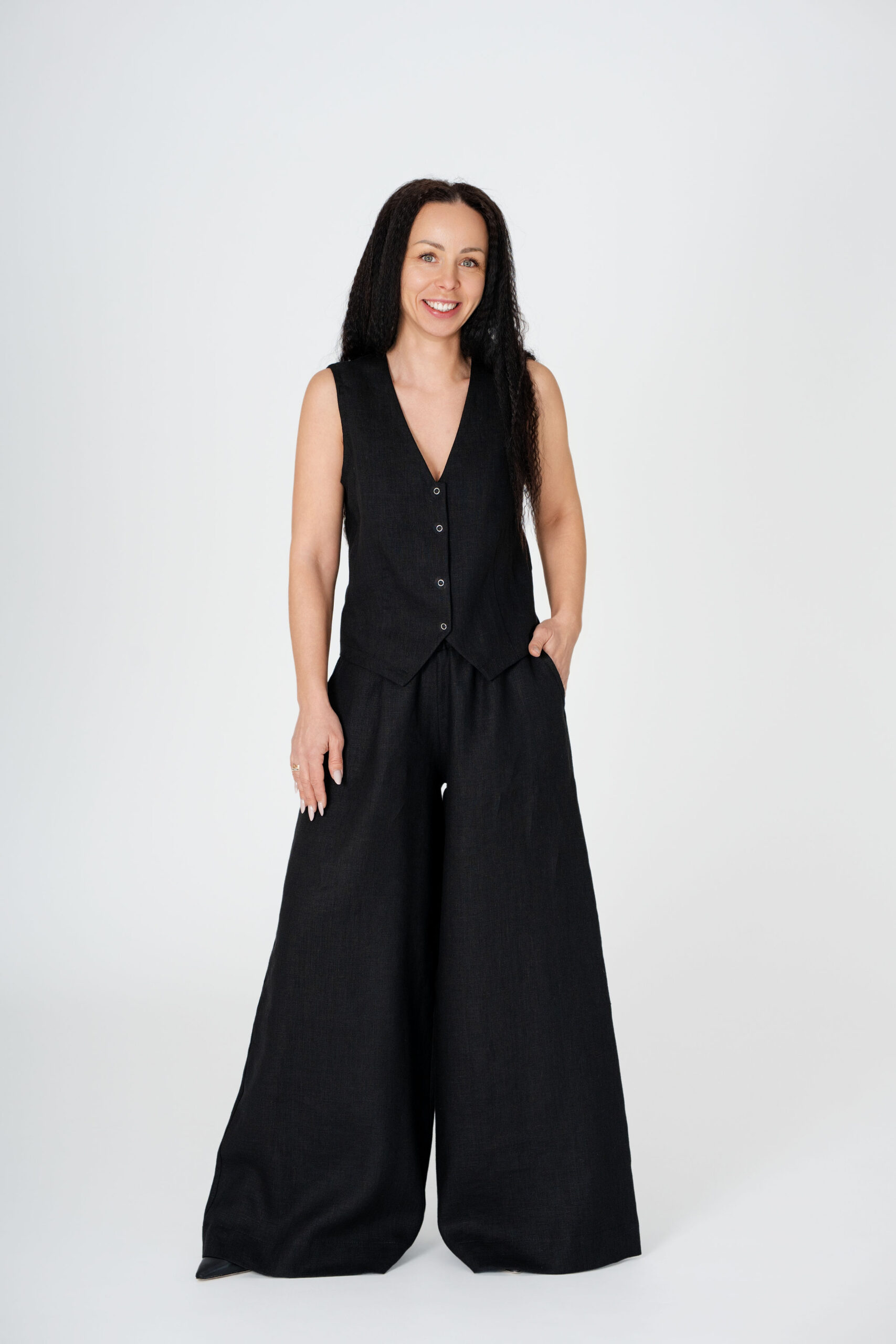 Sijonkelnės tolygiai platėjančios nuo viršaus į apačią, su guma ties juosmeniu. Turi patogias kišenes šonuose. Kelnių ilgį galite pasirinkti pagal savo ūgį. Galima rinktis iš dviejų ilgių.