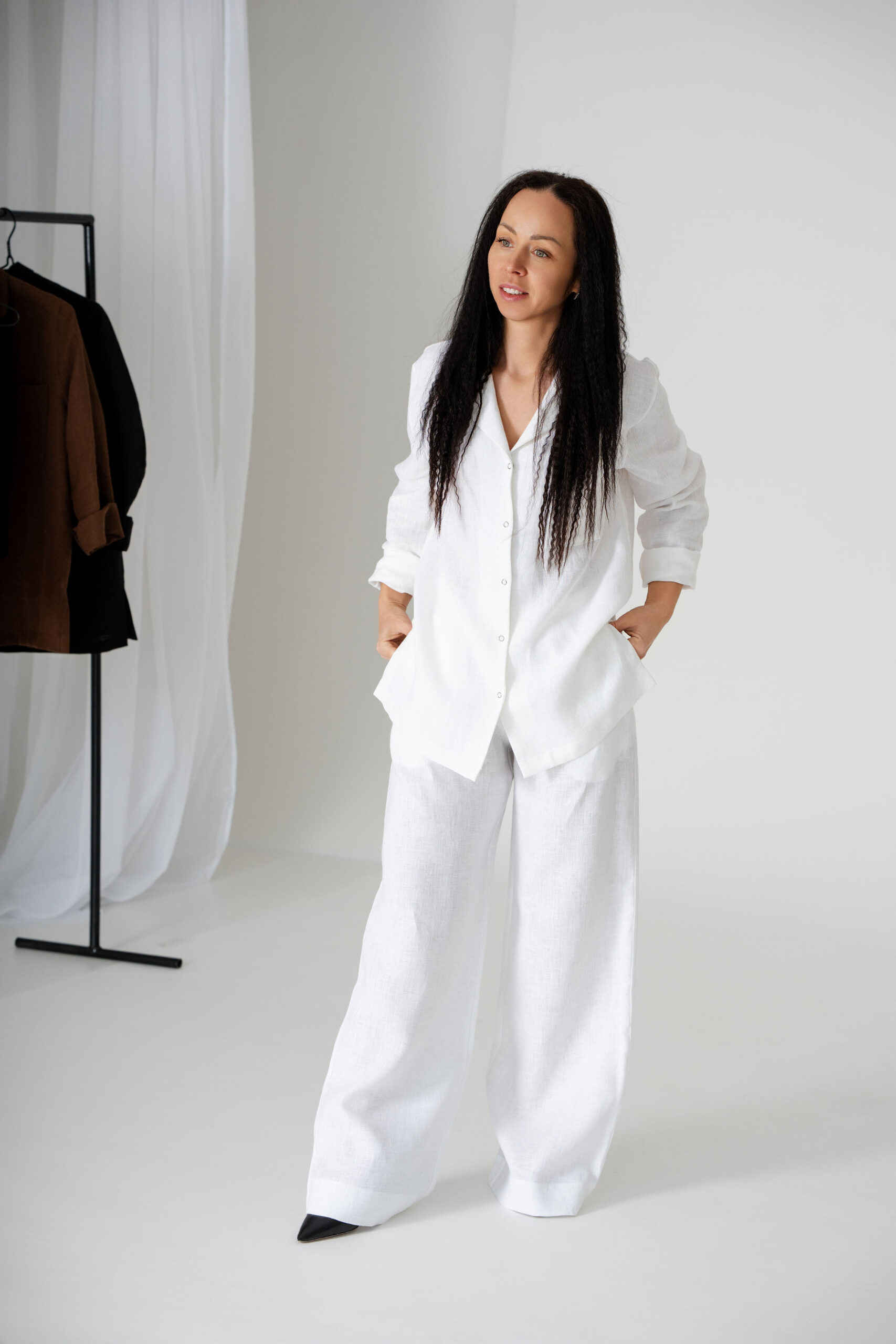 Baltos spalvos kostiumėlis dviejų dalių. Jį sudaro: marškiniai ir kelnės.